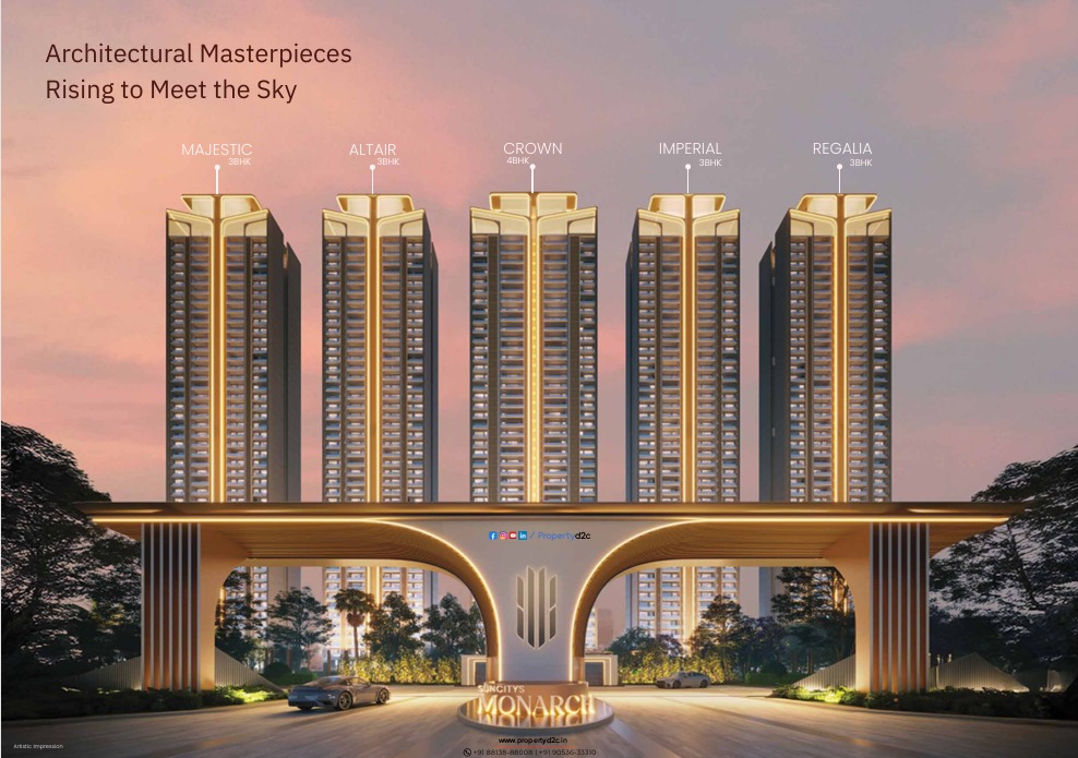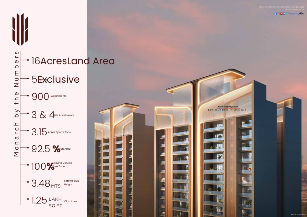 Suncity Monarch is a premium residential development spread across 16 acres of prime land in Sector 78, Gurugram. Designed for modern urban living, the project offers spacious 3 & 4 BHK luxury apartments with 92.5% open area and a dedicated 3.15-acre sports zone. With 5 exclusive towers, 3.48-meter slab-to-slab height, wide 10 ft. balcony decks, and a 1.25 lakh sq.ft. grand clubhouse, Monarch blends luxury, comfort, and active lifestyle seamlessly. It is a perfect destination for families seeking space, connectivity, and world-class amenities under one skyline.